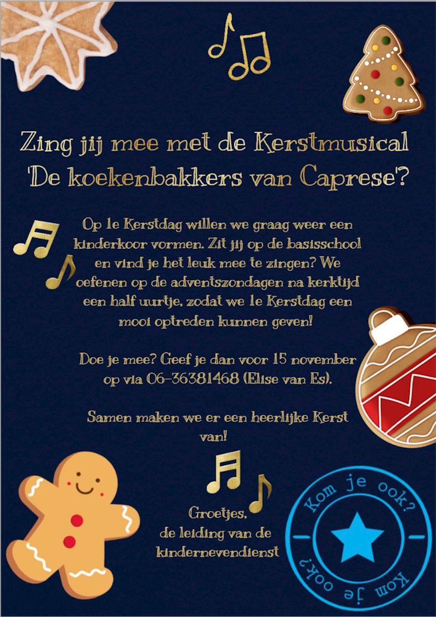 29 okt 2025 Zing je mee met de kerstmusical 'De koekenbakkers van Caprese'? ![]() Doe je mee? Geef je dan voor 15 november op bij Elise van Es. Klik hier om een e-mail te sturen. Groetjes, de leiding van de kindernevendienst. ![]() | ||