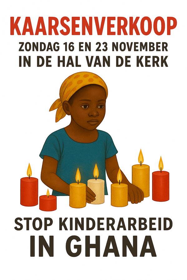 10 nov 2025 Koop een lichtje en geef een lichtpuntje! De diaconie verkoopt op zondag 16 en 23 november in de hal van de kerk kaarsen (lichtpuntjes!) tegen kinderarbeid in Ghana. Organisaties als Challenging Heights zetten zich in om deze kinderen te bevrijden, op te vangen en te herenigen met familie. | ||