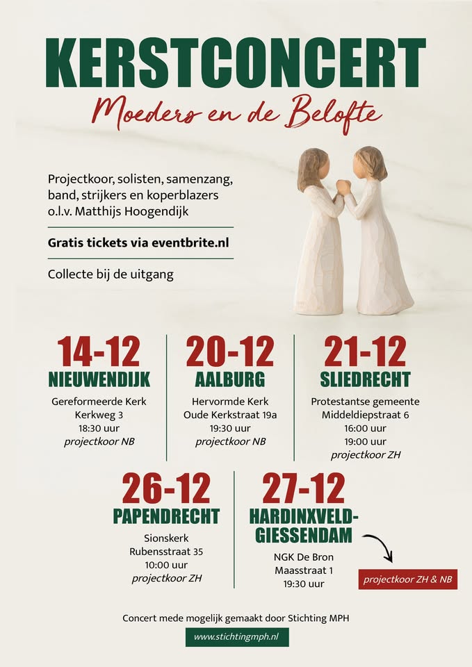 05 dec 2025 Kerstconcert 'Moeders en de Belofte' "ππ°π¦π₯π¦π³π΄ π¦π― π₯π¦ ππ¦ππ°π§π΅π¦" is een geheel nieuw programma geschreven door Matthijs en Teo Hoogendijk. Het programma is een muzikaal meeslepende uitvoering voor koor, solisten, samenzang, band, strijkers, koperblazers en verteller. Het ca. 60-koppige projectkoor uit Noord-Brabant zingt hedendaagse kerk- een aanbiddingliederen. | ||